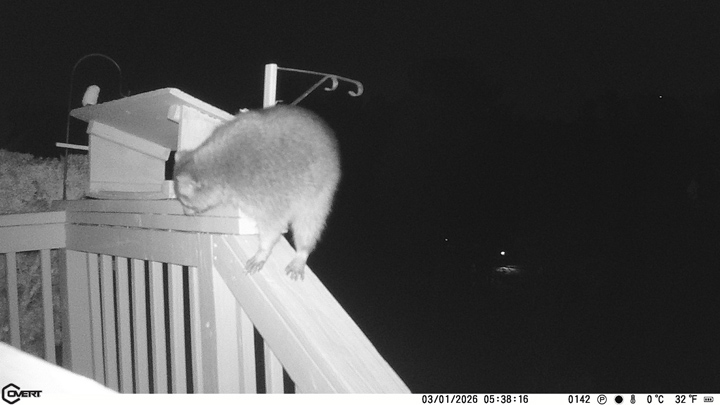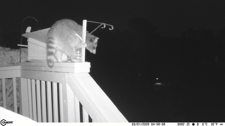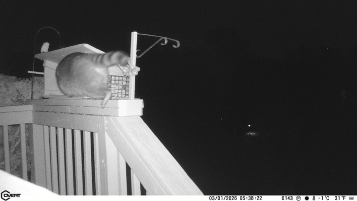 Finally I found something that works. I have several of those clips that go on the end of a dog's leash, to clip to the collar. Reasoning that if a dog can't break one of those a raccoon certainly couldn't, I put a couple of them on the suet cage. This fellow, who has been stealing our suet, was caught on my game camera last night: