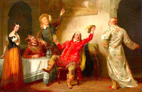 As it happens, "Twelfth Night" was probably the very first Shakespeare play I ever saw. When I was a callow stripling in the 7th Grade my teacher, Sister Mary Rigor Mortis, decided we should get some Culture so she hied my class off to Stratford, Connecticut to attend a performance at the now-defunct American Shakespeare Theater there. Now, "Twelfth Night" has a character, Sir Toby Belch (above, in red) a drunken, wenching, and thorougly disreputable reprobate. Upon our return to the school the next day Sister Mary Rigor Mortis tasked us to draw a picture of one of the characters in the play: needless to say, I chose Sir Toby Belch as my muse, depicting him sprawled on a couch with a bottle of sack, blind drunk. This, I hope, shocked her into never trying that trick again.