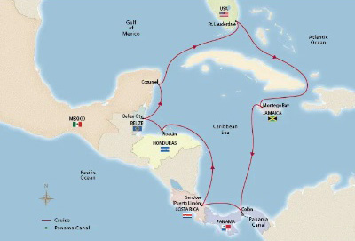 The itinerary was "Panama Canal & Central America," so for me the real trip was the Canal. Having read David McCullough's The Path Between The Seas about the Canal and its history (twice) the rest of the cruise in the form of shore excursions was "gravy," so to speak. Also I'm "into" ships (if you've followed this blog for any length of time you'll know that) so that almost any chance to go to sea is something I cherish. You can see the itinerary on the map at right: leaving from Fort Lauderdale, Florida, thence to Jamaica via the passage between the eastern end of Cuba and Hispaniola Island, thence to the Canal, and a few hops to Costa Rica, Honduras, Belize, and Cozumel. Back to Fort Lauderdale. As you can tell from the map above this involved a lot of "sea days," which was just fine with me. I like being at sea.