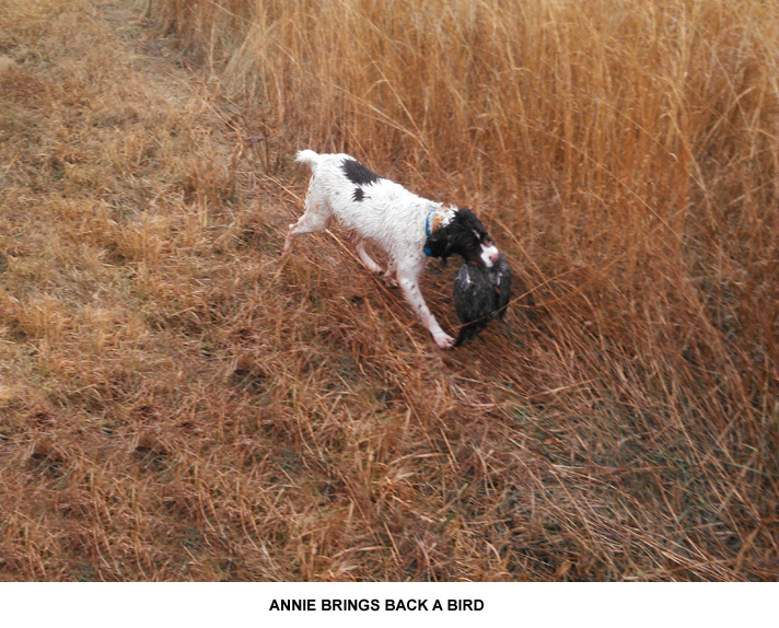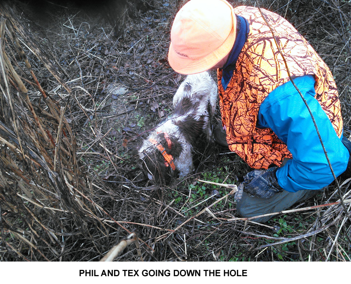 John's two turbo-charged Brittanies, Tex and Annie, continue to amaze me with their ability to find and retrieve birds. One of the wounded pheasants—believe this or not—went down a GROUNDHOG HOLE, and damned if Tex didn't sniff him out! He started to dig. We were all very skeptical that the dog could be right, but he was so persistent that we had to give some credence to him, especially as Annie was backing him up. Tex managed to get half his body into the hole, when Phil (who's 6'5" and has arms longer than my legs) yanked him out, reached into the hole, bringing forth the somewhat bedraggled bird, vindicating the dogs' judgment. I will never doubt them again. I asked if John had ever had that happen before, and he said he'd never heard of a bird diving down a groundhog hole. Perhaps this pheasant was unjustly executed: he might have been the progenitor of a new line of subterranean pheasants all by himself.