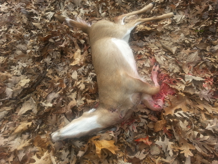 It was, in fact, a fawn smaller than the deer I'd shot on Wednesday morning. Total live weight couldn't have been more than 60 pounds. When I rolled it over, that's when we discovered it wasn't a doe, but a tiny button buck. No matter, antlerless deer are legal in Montgomery County, and that includes button bucks.