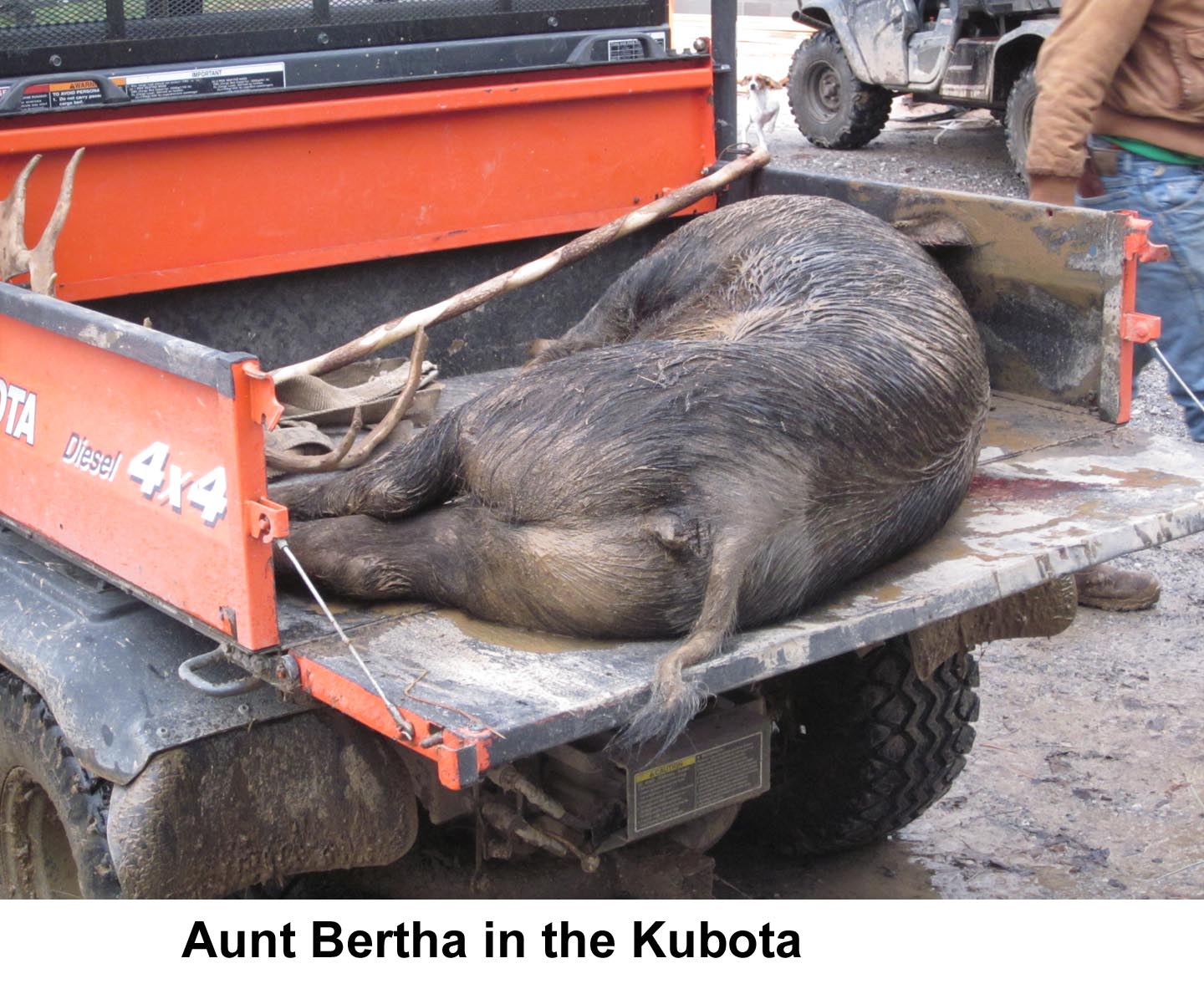 The guides ferried us to the shooting boxes in little Kubota ATV’s. I was mightily impressed with these vehicles. They never bogged down even when the mud was 6 inches deep or more and slicker than oiled snot. They would go up and down grades that I couldn’t have managed on foot without a walking stick. The ride was pretty bouncy, but these diesel-powered mechanical mules were as sure-footed as the real ones: while occasionally they would tip alarmingly, it would have taken some doing to roll one. When a pig was killed the guides went in to bring the body out, in the cargo area behind the seats. I’d never use an ATV here but if I owned a farm I’d certainly want to have a fleet of them.