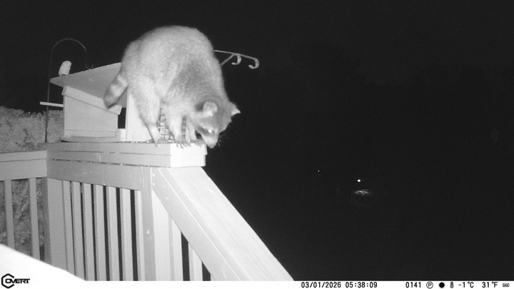 Finally I found something that works. I have several of those clips that go on the end of a dog's leash, to clip to the collar. Reasoning that if a dog can't break one of those a raccoon certainly couldn't, I put a couple of them on the suet cage. This fellow, who has been stealing our suet, was caught on my game camera last night: