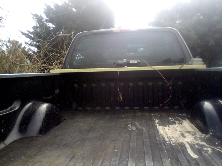 No, not like that. Today I went to the hardware store, bought half a dozen 3" sheet metal screws, and anchored the back edge of the 2x10 to the truck box. No deer is going to dismount that winch now.