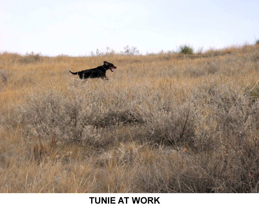 “Let's hunt back to the truck and try that big grassy flat over by the stock tank,” I suggested. Gary agreed and I led us off the hill and across the draw. We started up the little side draw that had been so windy a couple of days ago and Tunie hunted up one side then down the other.