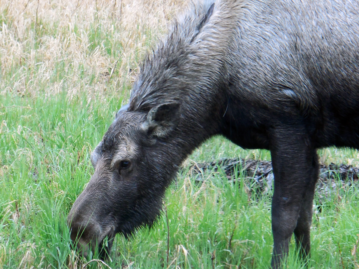 The Kenai Peninsula is a big place and seeing it involved a lot of driving: well over 600 miles with the various stops we made. The scenery along the roads was spectacular (outside Anchorage you can hardly go anywhere in Alaska without spectacular scenery) but with a dearth of wildlife. The total moose count was 6, one moose per hundred miles. That’s more than I’d expect in Maine or Vermont, but far fewer than there might have been. All were cows, one or two with calves in tow. There were no bears in evidence, not even a lousy little black bear or two. A few dubious eagle sightings (though we saw those later) and that was pretty much it for the celebrated Alaskan wildlife.