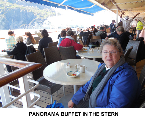 The food was excellent and very varied. We had a choice of traditional dining in the “Club Restaurant,” or informal dining in the “Panorama Buffet” in the stern. Everything was all-you-can-eat, and there was 24 hour room service plus a barbecue grill on the pool deck. And afternoon tea. And the “specialty restaurants,” i.e., an Italian one and a steakhouse. (These two last were subject to a “cover charge” of $25 each, so we skipped them. The food comes out of the same kitchens, without doubt; and since meals are included in the cost of the cruise, why anyone would choose to spend the extra money is beyond me.)