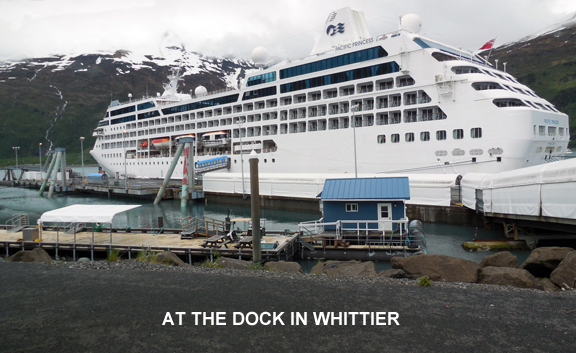The next day Princess picked us up in a motor coach, and took us to the ship in Whittier; about an hour and a half drive that involves taking the bus through a dual-purpose tunnel. In 1996 we’d had to take a train to Whittier, as there was no road access: today the same tunnel is used by motor vehicles as well as Alaska Railroad trains, careful scheduling being used to prevent—ahem—vehicular conflicts. Whittier is now a cruise ship terminus, and we remembered nothing whatever of it from our previous brief visit.