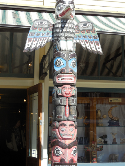 The ship made three port calls: Skagway, Juneau, and Ketchikan. These were so that people who couldn't find the exact kitschy souvenirs they wanted in the Shoppes would have another chance. I will not speak of these towns in detail, except to say that interspersed among the "historic" buildings all the streets were lined with souvenir shop after souvenir shop. Skagway has a population of 900 (in the Summer) but with four ships in port, 7000 tourists crazed with the lust for Chinese-made ulus and “genuine Alaskan” souvenirs of every type—not to mention Junque Jewelry—flooded the streets.