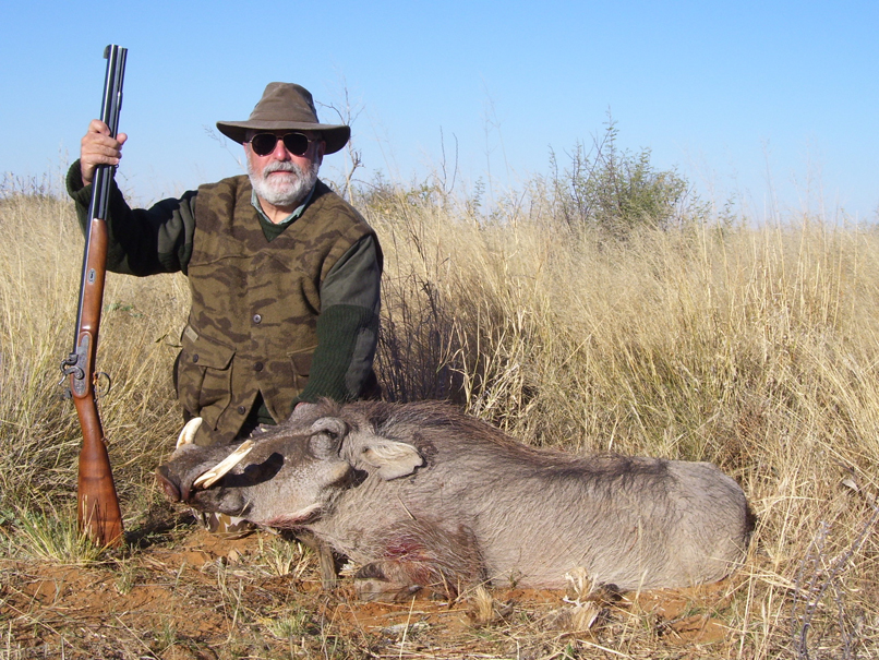 I chose to use my .54 on a warthog. I’d seen warthogs many times but never hunted them. As everyone knows, they’re every bit as ugly as…well, warthogs; and although they’re very nearsighted, they have sharp ears and a terrific sense of smell. They also have a reputation for ferocity, but the one I shot never got a chance to display it. As we were driving out into the veldt, France, the tracker (shown below right) spotted a warthog sleeping in the knee-high grass. Cornie wanted me to try stalking it, so we dismounted, I capped my gun, and off we went upwind. By that time I’d been on a few stalks with Cornie—who is a real pro—and I was definitely getting better at the business, though I have to admit I didn’t actually see the pig until he started to move.