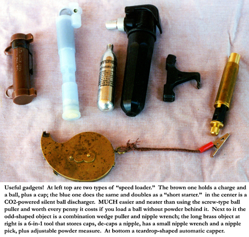 A few very useful gadgets that are well worth their cost and weight are shown here. Although getting off a rapid second shot from any muzzle-loader isn't really possible in the same sense as a breechloading rifle, "rapid" is a flexible concept, and with practice it's certainly possible for anyone to fire three aimed shots in a minute. The "speed loaders" shown at left are containerized packages of powder, ball, and cap, and with one of these a rifle can be reloaded in about 15 seconds if you know what you're doing and have your drill down. The 6-in-1 tool illustrated is made by Thompson/Center (as is the wedge puller) and is almost an entire tool kit in one neat package. The most useful feature of this tool is its ability to remove a live cap from a charged gun safely.