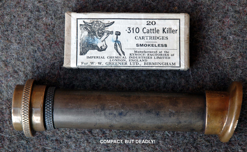 A Pocket Model Killer even has been a prop in a TV show: in an episode of the old TV series All Creatures Great & Small , the protagonist "James Herriott" pulls it from his little black bag and puts down an ailing horse. Even today, Greener Killers are being used in the United Kingdom by veterinarians who have a supply of ammunition or who have had theirs rechambered. The case is essentially a shortened version of the ".310 Cadet" round used in small-frame Martini rifles. The .310 Cadet isn't easy to find, either, but .310 Cattle Killer is far scarcer: thanks to its limited use it was never produced in large amounts, and hasn't been made for decades. Existing stocks were used up, and as UK gun laws grew progressively stricter in the 1960's and 70's, users switched to the easier-to-license captive bolt killers.