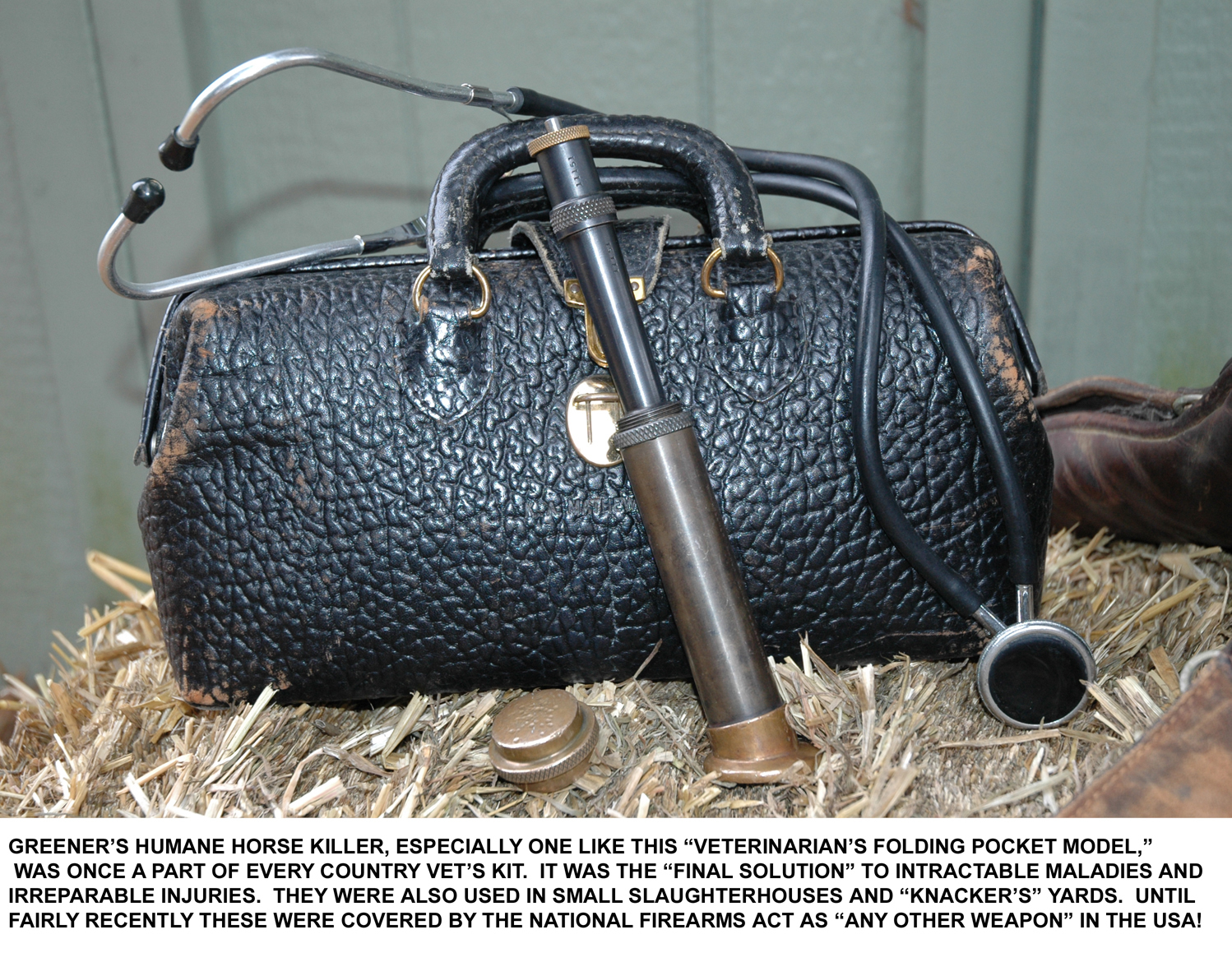 Greener's Humane Killers are the best known, though Greener was not the only manufacturer of free-bullet killers. Collectors of veterinary paraphernalia regard the Greener Humane Killer as a very desirable item, almost the "Holy Grail" of this rather specialized field of collection. Prices for a good one, especially the Pocket Model, range from $250 to $400 depending on condition and whether the original carrying case is included. The Folding Veterinarian's Pocket Model, shown below, was small enough to carry in the vet’s little black bag: in the first half of the 20th Century virtually every country and racecourse veterinarian carried one. Not many people realize it now, but well into World War Two, most European armies still had cavalry units; and they relied on horses to haul supplies and heavy weapons. Hence, there were soldiers whose job was to tend to them, and when needed, to put them down. The Pocket Model Humane Killer was standard issue to farriers and vets in the British Army.