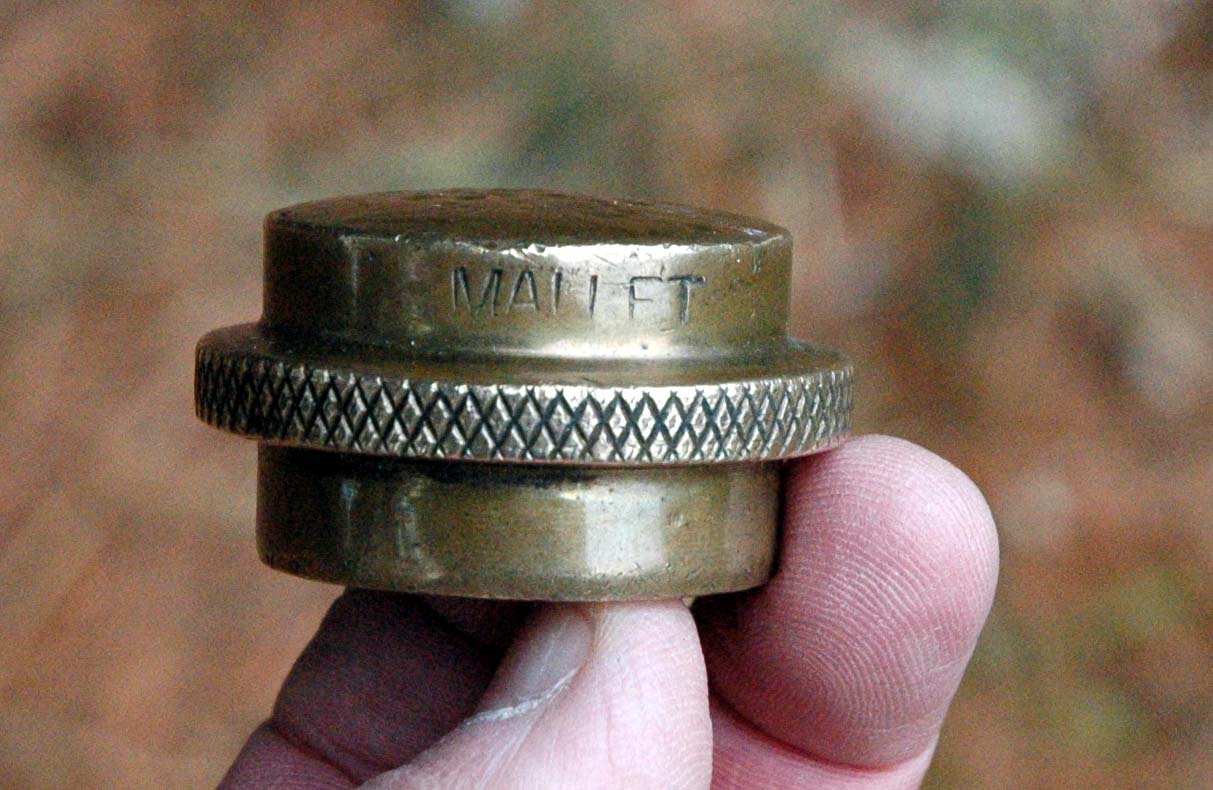 The firing mechanism is a spring-loaded firing pin screwed onto the breech after a cartridge is inserted. The bell is placed on the animal’s head, and the firing pin struck smartly with the “mallet” to discharge the round.