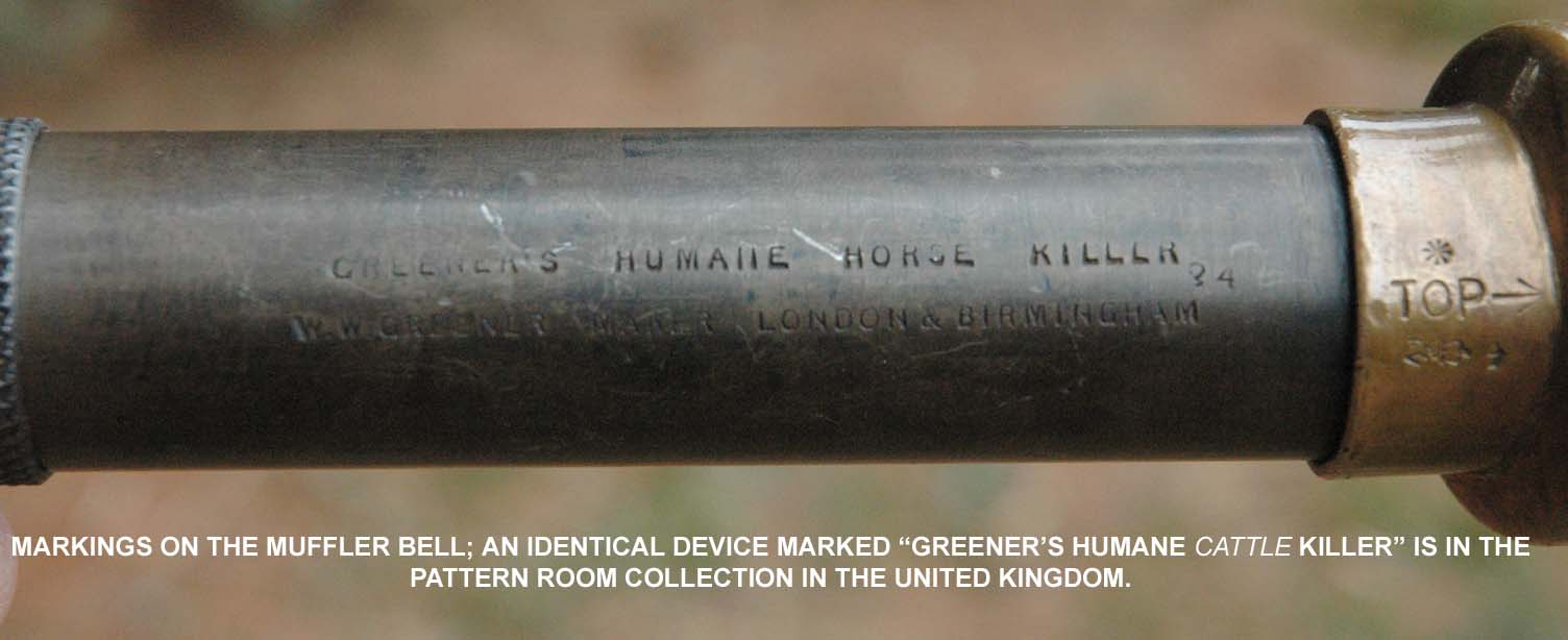 “Greener’s Humane Horse (or Cattle) Killer” was one of the very first practical free bullet killers. It was introduced in 1865, i.e., almost as soon as practical self-contained ammunition came onto the market. The device was a "smashing" success, manufactured well into the 1960’s. The firm has recently re-introduced a nearly identical device, the "Mark II" Pocket Model. Mr. Graham Greener, the current Director of the W.W. Greener firm, tells me that older Humane Horse Killers can be rechambered to .32 ACP, which is the cartridge used in the Mark II.