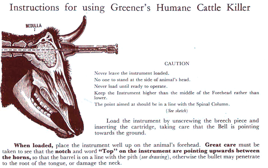Every hunter and defensive shooter is taught the mantra: "Shot placement is the most important consideration." This is no less true in the somewhat more technical exercise of slaughtering. Some indication of the way the Killer is used can be gained from the images above, and just to make sure everyone knew, Greener included in the package a set of diagrams showing the proper positioning of the killer on various species.