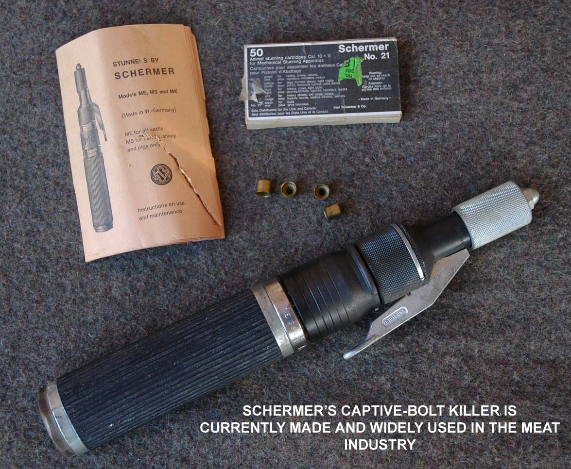 The term "captive bolt" is derived from the fact that the rod remains attached to the firing apparatus. A number of companies still make them (a Schermer model is shown above) for the meat trade: a captive bolt killer (or stunner) is more suited to industrial use for reasons of safety, since no actual bullet is fired. They are also not "firearms" under the law and require no special paperwork, even in restrictive locations.