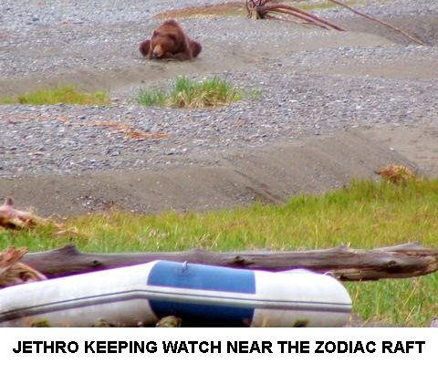 Next, he walked over to Warren's Zodiac, and began to lick and smell it. For the forth time, we stood there yelling at him and thought he might have to be shot. Bill K. was elected to shoot into the log that the Zodiac and Jethro were both on: he made an excellent shot, just under Jethro's feet. Jethro just looked at us defiantly. I thought he was coming for us; and I'm sure he was thinking about it.