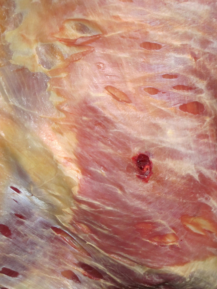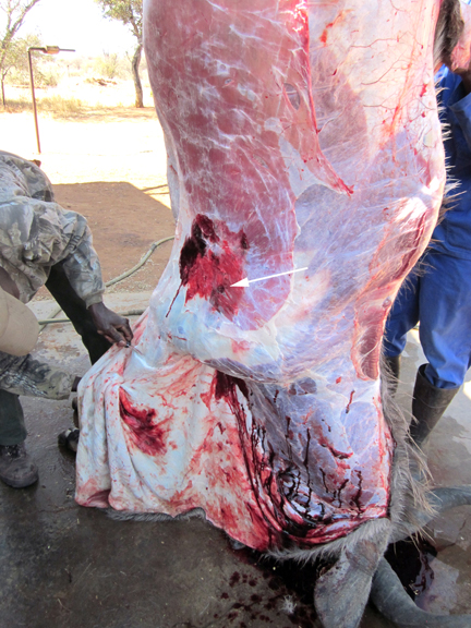 When the skinners removed the cape, the very large blood shot area on the underside of the neck was obvious. The arrow indicates the exit point of the bullet in the image below.