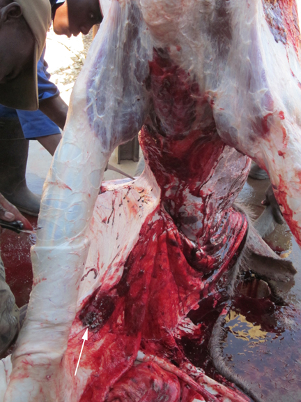 Matt shot a very large old kudu bull with his .300 RUM in the neck. The first image presented here shows the entry wound from his bullet. The arrow points to the actual bullet hole. The kudu was shot at the top of the neck: the entry wound has extensive blood-shot meat.