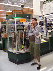Mike had paid half the price up front when he placed the order and had been given a 10% discount on the total price. That involved more Wal-Mart gyrations. None of the Sporting Goods ladies knew how to handle discounts, which apparently aren't routine in their department. Eventually they got guidance from an eighth person: the jewelry counter clerk, don't ask me why. Once that was done, Mike paid off the balance. One of the supervisors, again in accordance with Wal-Mart policy, then carried the boxed gun to the door. I've encountered this before too: presumably they do that lest the buyer load it up and rob the store he just bought it from. Considering that there are people dumb enough to admit they're felons on the Form 4473, I suppose there must be some who would rob a store they've just shown two forms of ID.