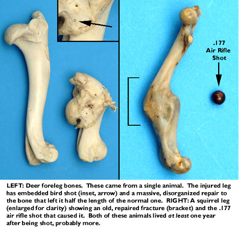 I have included two such examples: one is the shattered humerus (upper foreleg bone) of a white-tailed deer. This deer was shot by some imbecile with a load of small birdshot at close range, in an act of wanton sadism. This deer healed (though with loss of function) and lived for at least a year afterwards, probably longer: the bone has been extensively remodeled and repaired and it's clearly that of a mature animal. The second example is the femur of a tree squirrel. Again, this leg bone has a very old and well-repaired fracture, caused by an air rifle bullet, which I found embedded in the leg muscle close to the injury it caused. Nor are such phenomena confined to limbs: I have handled a hippo skull that had not one, but three badly corroded .303 military bullets embedded in it. The hippo had been killed by a hunter who took it with a single heart-lung shot, and who found the bullets when the skull was cleaned for display. While there's no doubt that the hippo had a phenomenal headache for a while, he lived. These animals, all victims of callousness, inadequately-powered weapons, or bad marksmanship, certainly felt pain; but the fact that they were equally clearly able to make good their escape and hole up somewhere until the injury was dealt with indicates that their tolerance for it must have been very high indeed. Probably that pain tolerance was passed along to their offspring, too.