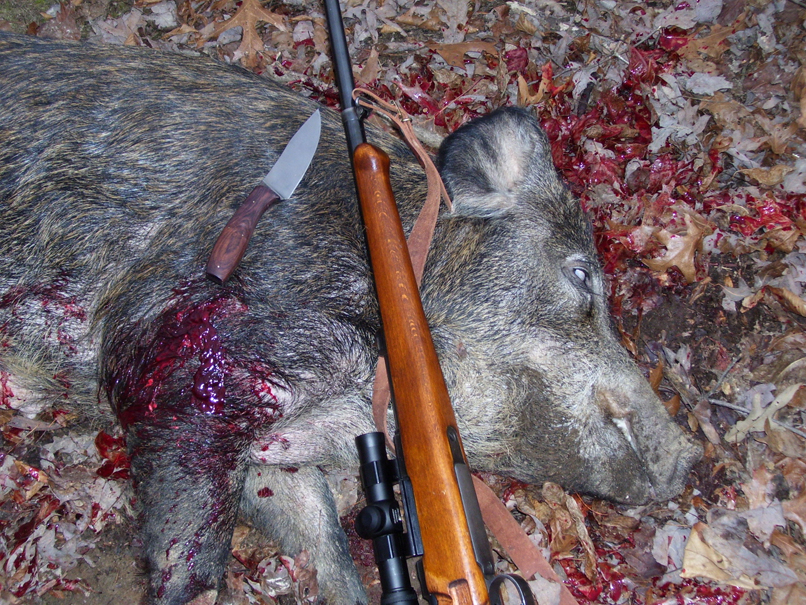 Sure enough, within 15 minutes I looked up and a pig was casually sauntering through the bottom, moving right to left. I brought up the Husky, put the crosshairs of the shoulder, and fired. The pig stopped, staggered a little, wavered a bit, and dropped dead. Later inspection showed that the shot had hit in the left shoulder, traversed to the right and exited, and in the process shredded the heart. This is exactly the same result that I had with that rifle on the last deer I killed. Again, the ammunition was Remington's 8x57 factory load, a 175-grain Core-Lokt round nose soft point, which performed perfectly. The distance was perhaps 40 yards.