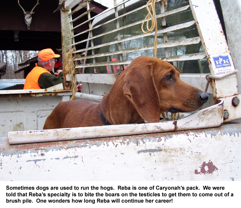 I inquired about a fence, and yes indeed the place is fenced: this is apparently a requirement of Tennessee law, since hogs can do a lot of damage and the neighbors don't like it when a herd of them rips up a cornfield. And of course, Caryonah does have some money and effort invested in their hogs and don't wandering away to be shot in someone's pasture.