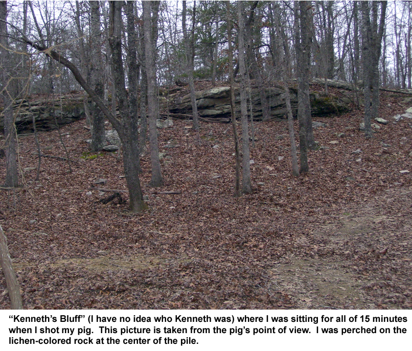 Back into the Suburban, bouncing along an even worse track than the first one to a site the guide called "Kenneth's Bluff." This proved to be a rocky outcropping overlooking another bottomland with a bog in it. "Set raht thar," he told me, "and watch that bottom. They'll come down that hill over thar." By then it was 3:00 PM (lunch had been another leisurely affair). He went off with the other hunter to make sure he didn't get lost tramping around the woods.