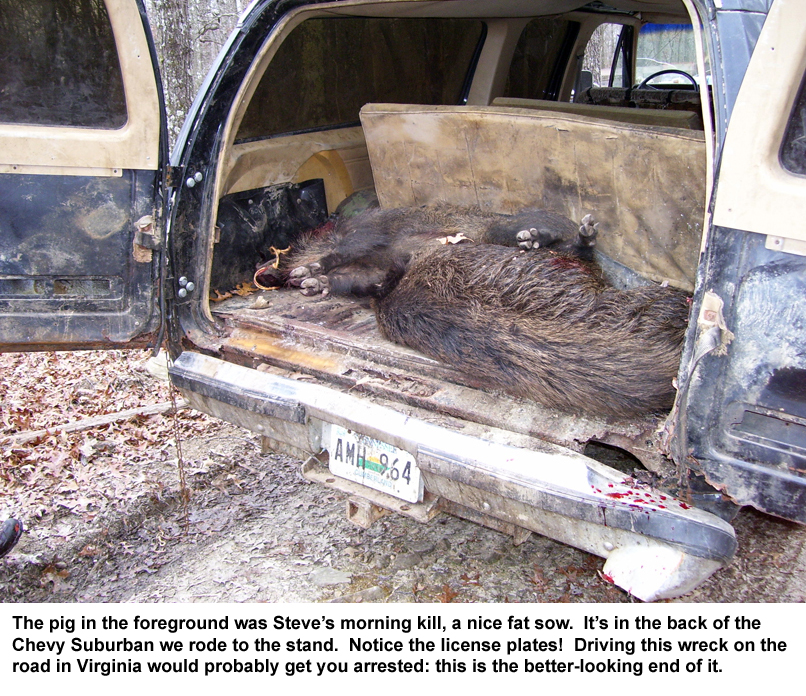 The pigs at Caryonah are more or less stocked: they're pigs of a certain type, purchased at auctions or sales and released onto a large enclosure to breed. Given the abundant food supply, they breed like the dickens. I asked one of the guides how many hogs there were on the place, and he replied, "We don't know. Hundreds, for sure." Presumably they breed faster than they can be killed off, but if not...well, it's a simple matter to get a few sows and turn them loose to rebuild the population base.