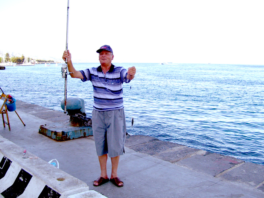 Our ship docked in Messina Harbor. We were last in Messina in 2006, when I had a professional meeting there. The picture of a proud fishermen below was taken then. At that time you could stand on the wharf: no more. Today the security is tight, you can't get down to the water any longer, and I suppose that man has to find somewhere else to catch his anchovies.