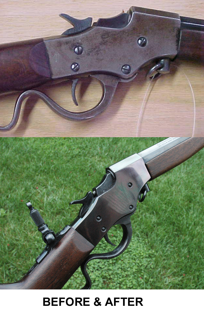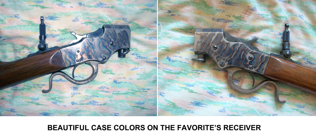 Depending on what references you read, Favorites were case colored (as the Leeson gun is) but also were available in blued finish. I shipped my rifle off for refinishing to Mr Dave Thomas, who runs Second Amendment Gun Repair in Pinehurst, Idaho. Dave is a master craftsman and returned it to me with a dazzling high-polish blue on the receiver and barrel, preserving all the markings.