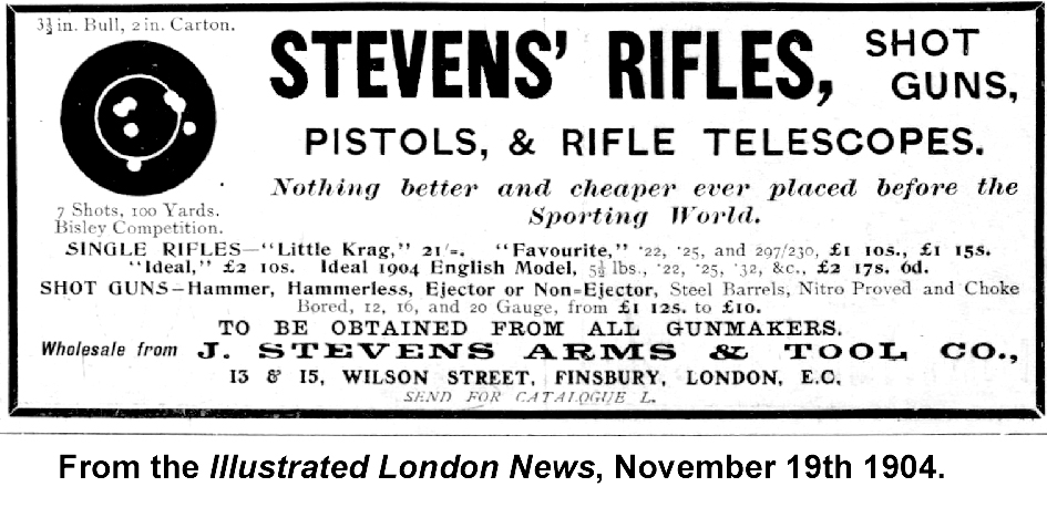 Mr Macer displays on his web site what is undoubtedly is a Stevens Favorite, not a Model 44. It has some odd features, which led us to investigate how this quintessentially American rifle ended up being sold as a "rook rifle" in Leeson’s shop in Edwardian London. Researching the archives and the Internet, and old catalogues, we’ve uncovered some very interesting information.