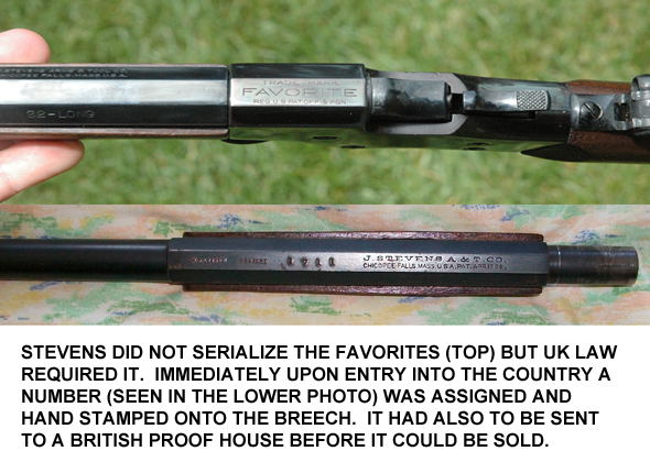 The rifle is unquestionably a Favorite and not a Model 44. It would appear to be what Stevens’ catalog listed as a “#17,” ordinarily chambered for the .25 Stevens rimfire round; on the face of the receiver there is another marking “17 C,” which we think means “No. 17, C(enterfire).”