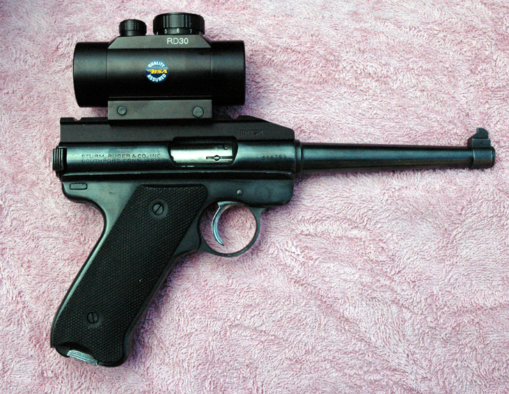 I like to carry a .22 with me when I hunt deer. This is legal in Virginia in the rifle season, and usually I've brought along a nice Ruger Single-Six revolver for the purpose. However, far and away the most accurate handgun I own is a Ruger "Standard" Autoloading Pistol I bought in my college years. Forty-plus years ago I paid the magnificent sum of $41 for this gun, brand new. In those decades it's been used as a trainer, mainly; it's had at least 30,000 rounds through it, but it's as good as the day it left Southport in 1967.