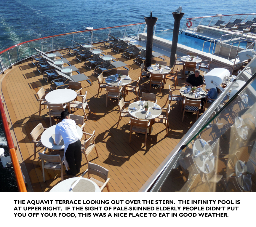 Cruise ships are very much about food: lots of it, all the time, and Viking Sky does food admirably. “The Restaurant” is the main dining facility. Very plush, like a high-end restaurant on shore. There were two “optional” restaurants: the “Chef’s Table” (with a varying fixed menu decided upon each day by the chef) and “Manfredi’s,” the obligatory but nonetheless very good Italian one. Both of these required reservations but neither imposed an additional charge (unlike other cruisers). There was also a less formal “World Café” whose thrice-daily buffets were almost obscenely abundant and varied. Al fresco tables were available at the café and on the “Aquavit Terrace” (above) at the stern (where you could munch away while watching people cavort in the Infinity Pool).