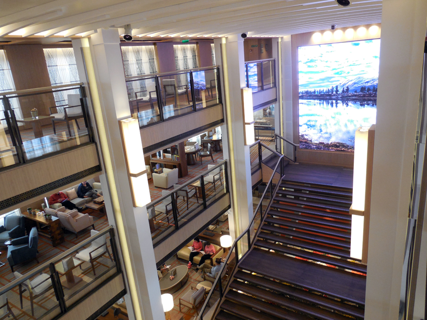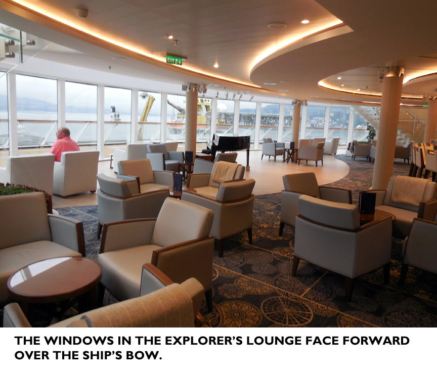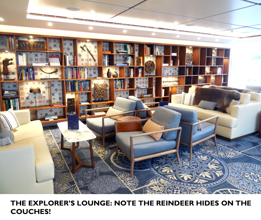 In addition to the atrium there are other lounging areas: The Winter Garden (in which “high tea” is served daily), the “Explorers’ Lounge” (whose couches are overlain with reindeer hides) which allows views out over the bow.