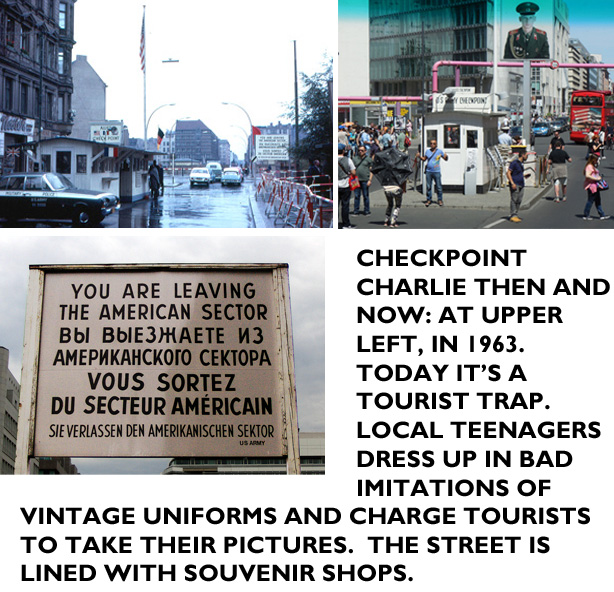 We didn’t spend much time in Berlin. It’s a 3-hour train ride from the port on the Baltic (Warnemunde) where we stopped, and in the end we had only about 4 hours. We did see the main sights: “Checkpoint Charlie,” the Brandenburg Gate, and a chunk of The Wall that’s still standing. There’s no way to know if you are in “East” or “West” Berlin these days. We had a nice (and expensive) lunch, and then headed for the pickup point and back to the ship.