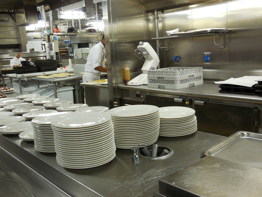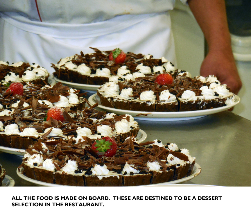 At one point we did a brief tour of the galley, acres of spotless stainless steel occupying most of the length of one deck and staffed by literally hundreds of chefs, sous-chefs, cookers, dishwashers, etc. I asked one supervisor how much crockery and tableware was on board to feed 900-odd passengers and 700-plus crew, and was told, “We have no idea. A lot.”