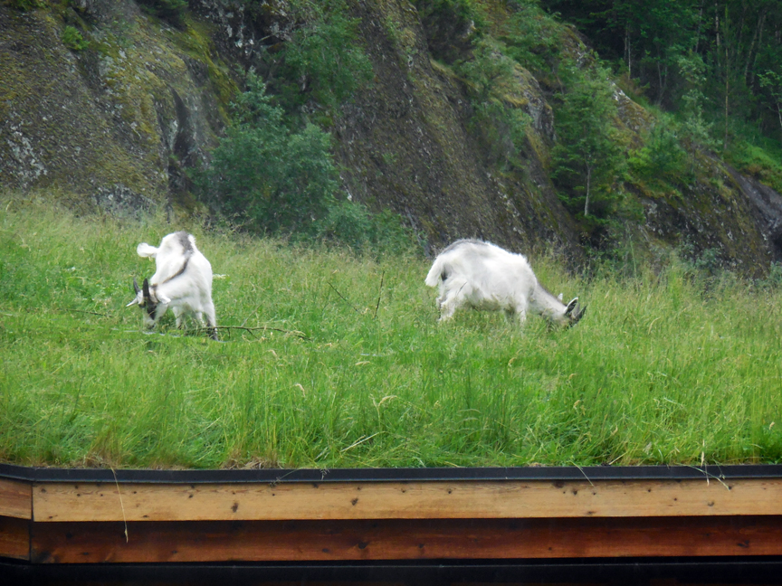 Eydfjord hasn't much to offer as a town, but it boasts a very nice nature museum, highlighting the wildlife species to be found in Norway. These include moose, foxes, etc., many of which are also indigenous to Alaska. What they call reindeer we call caribou: same animal. The museum is built in traditional style, which means it has a roof on which grass is growing. Now, when you have grass on your roof, you have to keep it trimmed: and a roof isn't a good place to use a power lawn mower. So, traditionally, the roof lawn mower is...a goat.