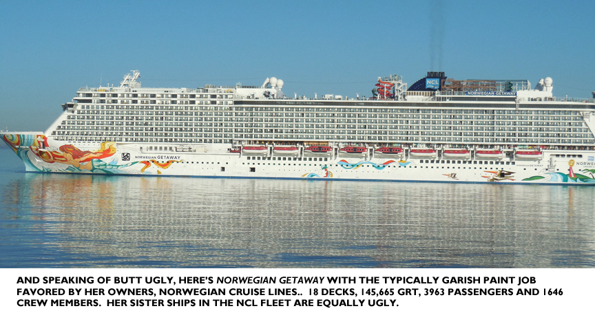 She has a “yacht bow,” widely flared to fend off spray, and though her stern isn’t the graceful “spoon” shape of, say, United States’ neither is it the straight, flat stern of the bigger cruisers. It has some sort of low, flat, extension at the water level whose purpose I don’t know. Sometimes on other ships these are for people to swim from in warm water, but I don’t think that’s what it’s for. Leaving that odd stern aside, Viking Sky is in my opinion a very pretty ship; especially when compared to the tubs shown above.