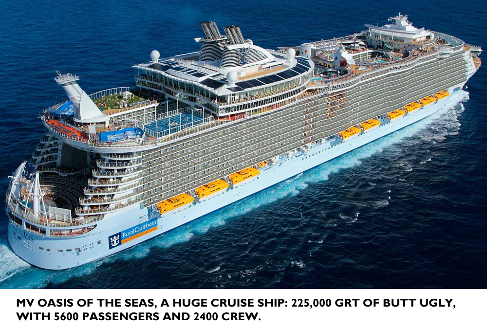 The typical cruise ship takes this description to its ultimate conclusion. Any pretense at elegance is superseded by the necessity to cram as many passengers as possible into the available length of deck space.