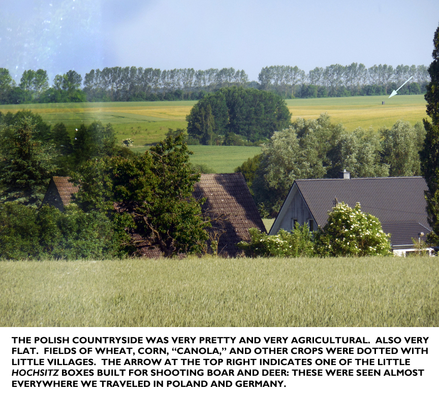 The north German plain is extensively farmed, and as the train clattered through it southwards I noticed that whenever we were in an area of open fields of crops, there were little shacks on stilts. These are what the Germans call a hochsitz (“high seat”) used for shooting boar and deer! Any number of them were also visible in Polish farm country. Wild boar are very common in these areas, as are roe deer, and this is one style of hunting them.