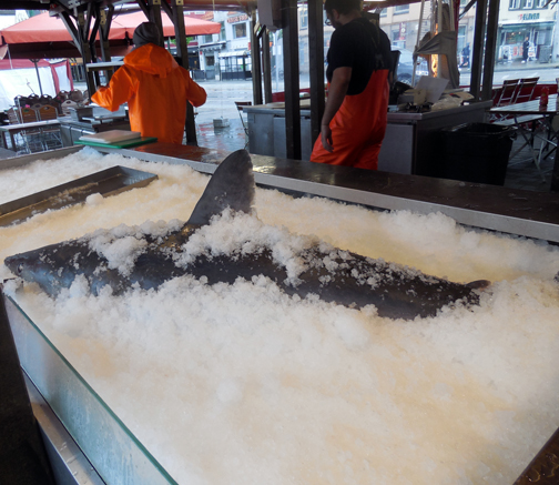 A whole shark was brought in that morning. The fish stand operator said that sharks couldn't be specifically fished for, but if they took one as "by catch" it could be sold. I suspect that if shark is a big seller, a fair number of "by catch" sharks end up on ice like this one.