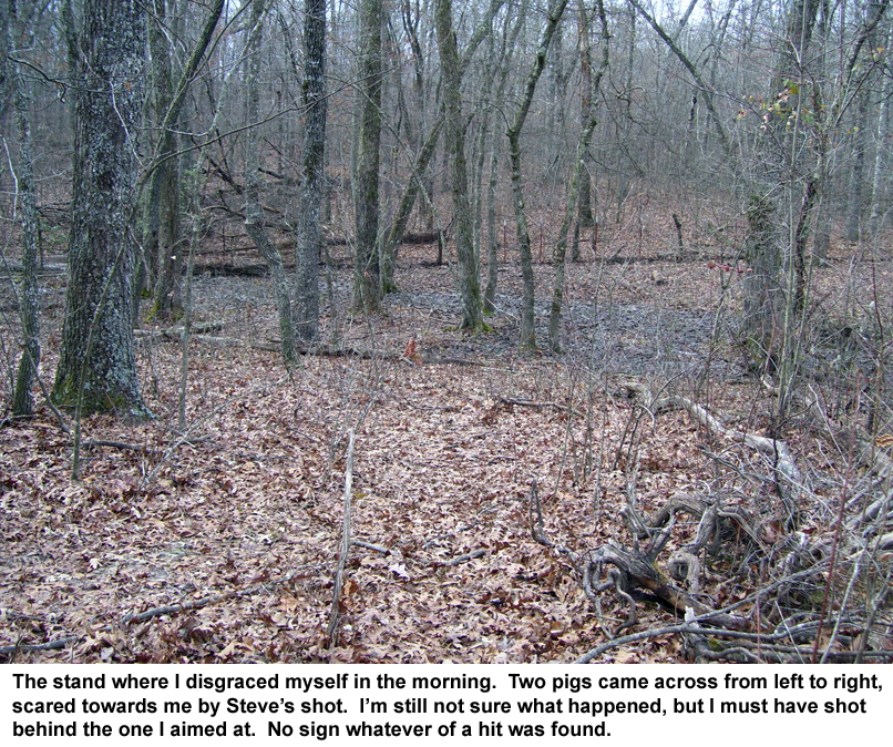 Some people can't stand to sit still for a long period of time, but if I have any talents as a hunter at all, it's the ability to stay in one place until an animal comes along: I'm a champion sitzjäger, probably because I started hunting on plots of ground where you couldn't go 400 yards in one direction without crossing a property line (and also because I'm pretty lazy). So my guide parked me on a stand site overlooking a muddy slough. There was a hog-wire fence along one side of the slough, and an obvious pig track along that. An older gentleman named Steve, also not one to hoof it through the woods, was set down about 75 yards to my left, so the two of us could watch the fence line, the slough, and the relatively clear space on the other side of the fence. We were assured that the pigs would come along. I guess we got there about 8:30, and not long after we started hearing shots near and far as other members of the group encountered them, and waited our turn.