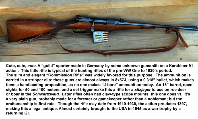 Mine was never a military rifle, however. The Model 1896 based sporters were made for the European commercial market and they lack the "thumb cut" on the left side of the receiver typical of military Mausers. It therefore isn’t a converted Swedish military rifle, as all of those do have the thumb cut. Oddly enough it does have the stripper-clip slots in the receiver bridge. The caliber is 8x57, called “8mm Mauser” in this country.